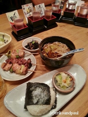 塩加減がちょうどいい焼き鳥と、濃い味のしょっぱいお蕎麦に、大きなおにぎり、そして日本酒・・・。