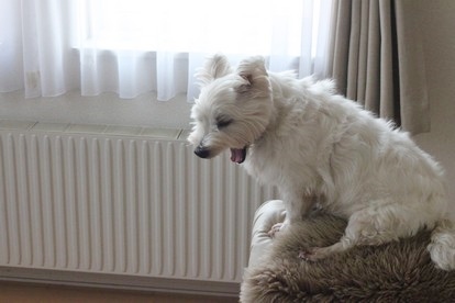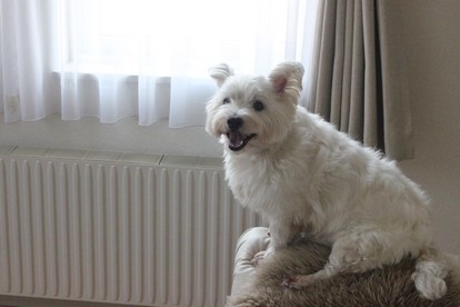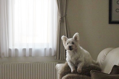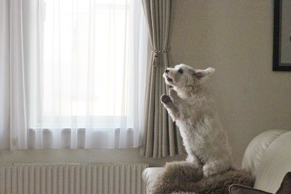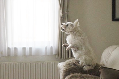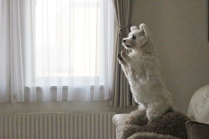 2階のリビングの窓から、遠くに「不審人物」ならぬ、「不審犬」を見つけた時の基本姿勢。