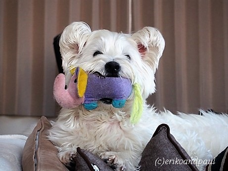 毎朝必ず起きてすぐにこの象さんを口にくわえ、クーン、クーンと普段は出さない声で鳴きながら、部屋中を歩き回ったり、外を見たり。