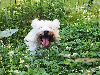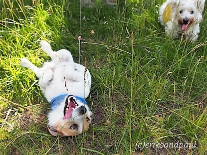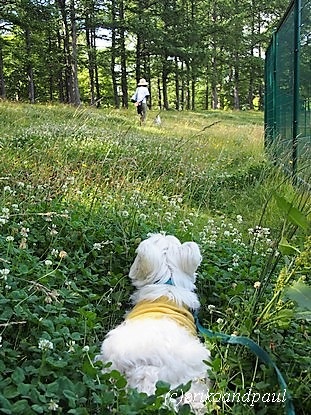 まったりバブーは、草の中に埋もれて、暑さをしのぎながらグリちゃんと飼い主さんをニコニコ見守っています。