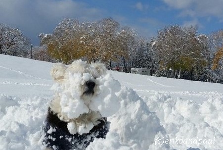 そんな中の散歩、雪まみれ、ペッタンコ!