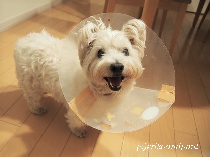 ガムテープで頑丈に固定されたエリザベスカラーのオーラをまとった輝く笑顔♪