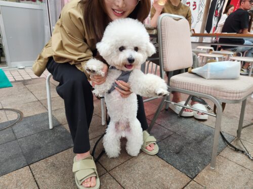 可愛いわんこも外飲み中で、飼い主の素敵なお姉さんが「ふわっふわのわんこ」を触らせてくれました。