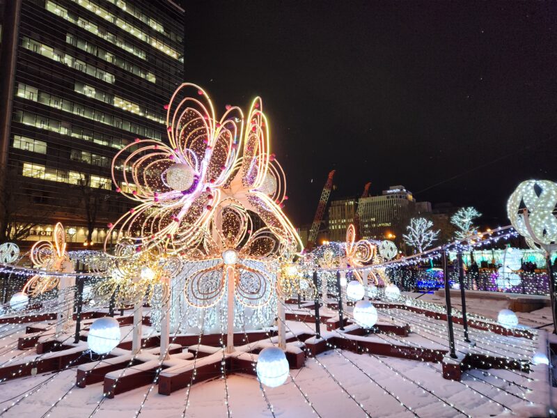 東京の表参道とかの素晴らしいイルミネーションを見てしまうとささやかに思えますが、札幌は雪との組み合わせがやっぱりいいですね。