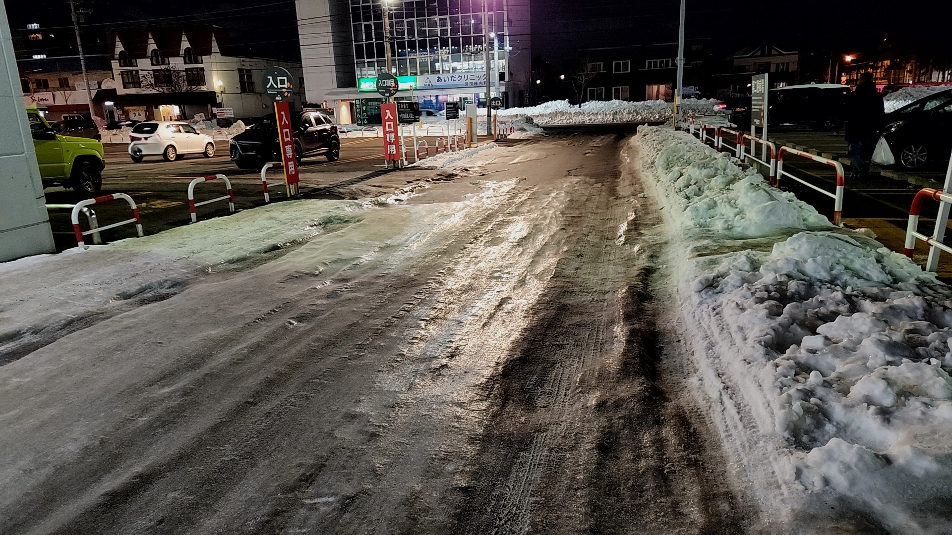 こちらは帰り道に通った近所のスーパー横の写真ですが、ツルツル、テカテカ。