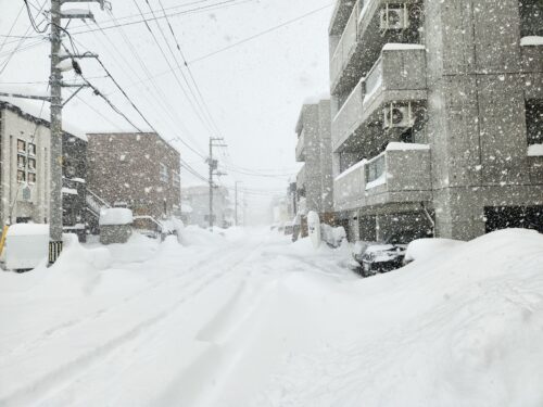 雪道がザクザクで車が何台も埋まったり、歩道に雪が積もって道がなく、車道を歩かざるを得ない状況だったり、住宅地はどこもそんな感じなのでやむをえません。